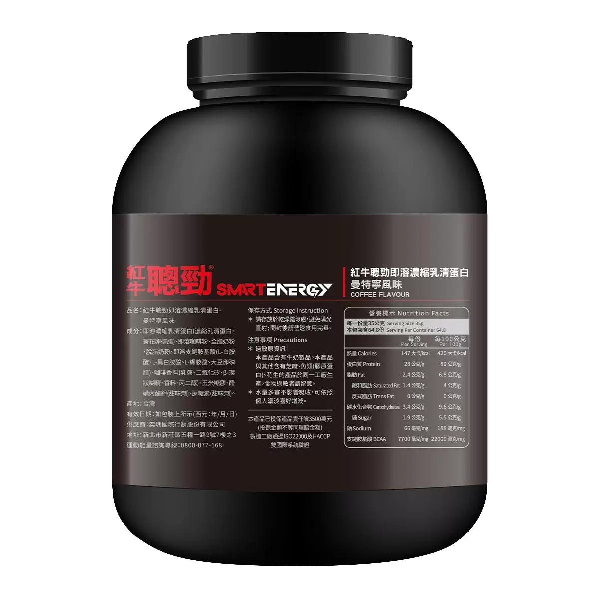 | 成分 | 即溶濃縮乳清蛋白(濃縮乳清蛋白、葵花卵磷脂) 、即溶咖啡粉、全脂奶粉、脫脂奶粉、即溶支鏈胺基酸(L-白胺酸、L-異白胺酸、L-纈胺酸、大豆卵磷脂)、咖啡香料(乳糖、二氧化矽、β-環狀糊精、香料、丙二醇)、玉米糖膠、醋磺內酯鉀(甜味劑)、蔗糖素(甜味劑) |