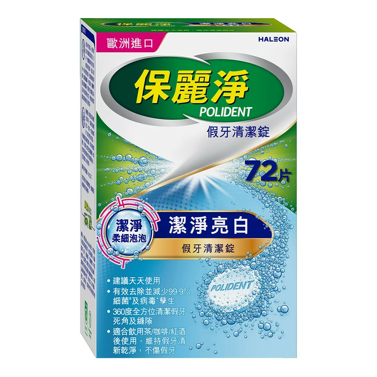 | 副作用、禁忌及其他注意事項 | 1.此為外用產品,請勿將假牙清潔錠直接放入口中。接觸眼睛可能引起嚴重刺激感,請以清水小心清洗數分鐘,若眼睛刺激持續,請諮詢醫師。若誤食,請攜帶產品諮詢醫師。 2.請放在兒童眼見未及或不能取得的地⽅,避免誤食清潔錠或誤飲假牙浸泡液。 3.接觸錠片或浸泡液後應立即洗手,並避免接觸眼/口。 4.對任一成份敏感者,請勿使用本產品,可能會造成過敏反應,若有刺激感產生,請停止使用並諮詢醫師。請勿飲用浸泡過的假牙清潔錠的水、勿當成漱口水來使用。 5.請保存於乾燥處,30°C以下。 6.若您的假牙有鬆動問題,建議搭配保麗淨假牙黏著劑。 |