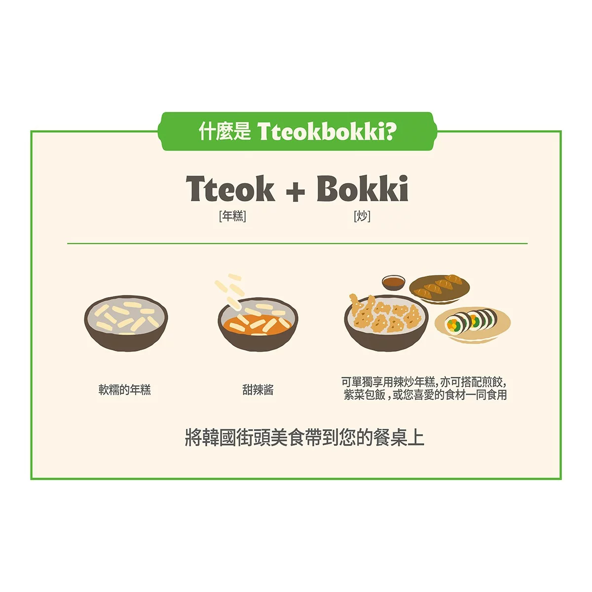 | 使用方式 | 加熱調理條件: 1.將年糕用水洗淨。 2.將年糕、調味粉和3/4杯水放入中等大小的煎鍋中,以大火煮沸。 3.煮沸後,轉中火,繼續翻炒2分30秒。偶爾攪拌以防止燒焦。 |
