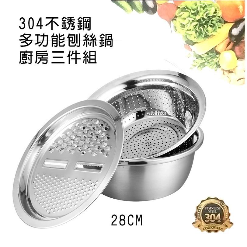 304不鏽鋼多功能刨絲鍋三件式料理瀝水盆 洗米/刨絲/瀝水.三合一 28cm