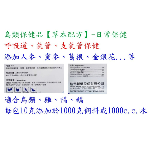 鳥用保健品/呼吸道保健、氣管保健、支氣管保健。添加人參、黨參、葛根、金銀花...等