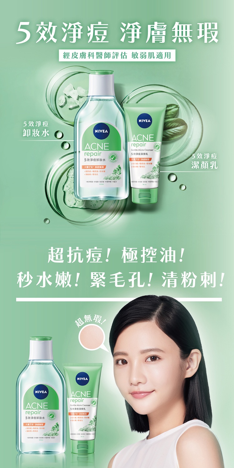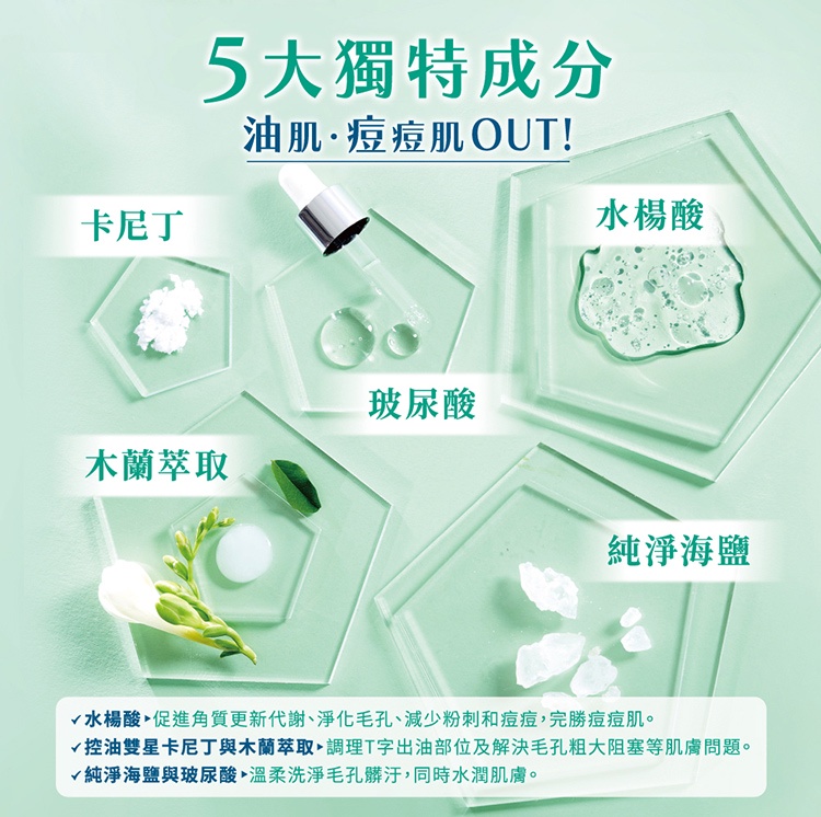 5效淨痘 淨膚無瑕超抗痘、極控油、秒水嫩、清粉刺、緊毛孔經皮膚科醫師肌膚相容性評估,敏感肌適用5大獨特成分 : 純淨海鹽、水楊酸、玻尿酸、木蘭萃取、卡尼丁無添加酒精、色素、礦物油,不刺激。