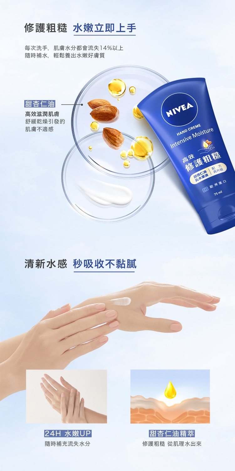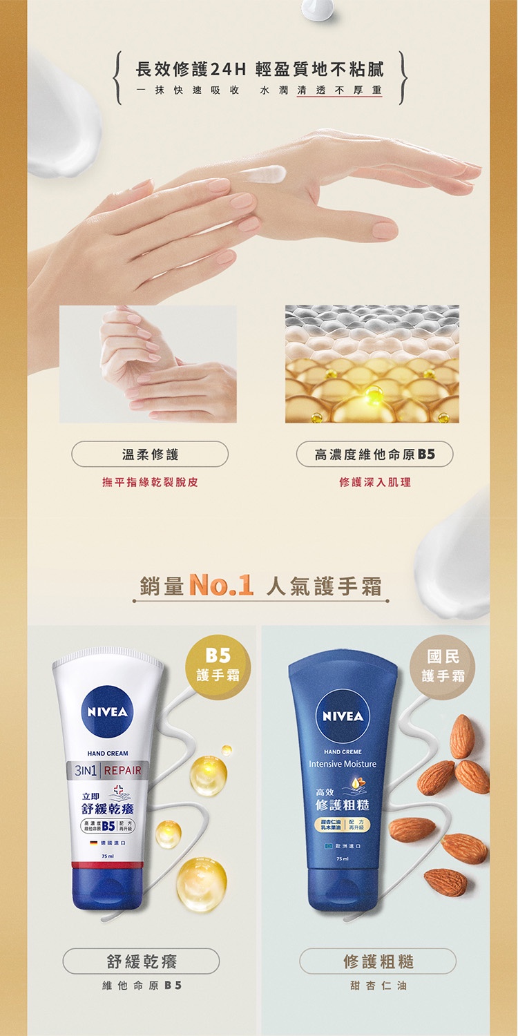 全新妮維雅護手霜系列,採潤澤呵護配方,能長時間滋養潤澤肌膚,給予雙手全天候的柔嫩呵護。