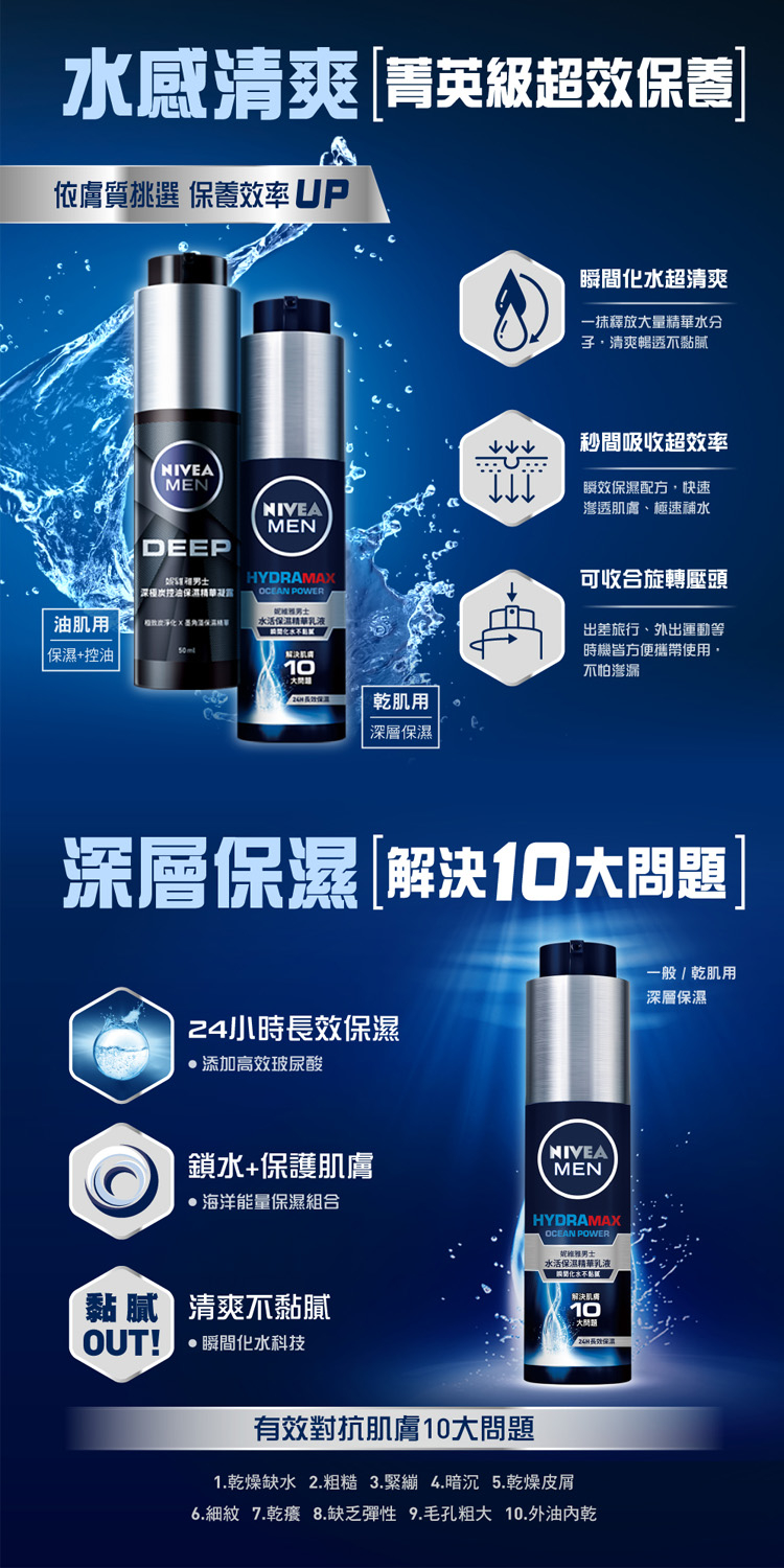• 專為男士肌膚設計,獨創瞬間化水科技,肌膚暢透不黏膩