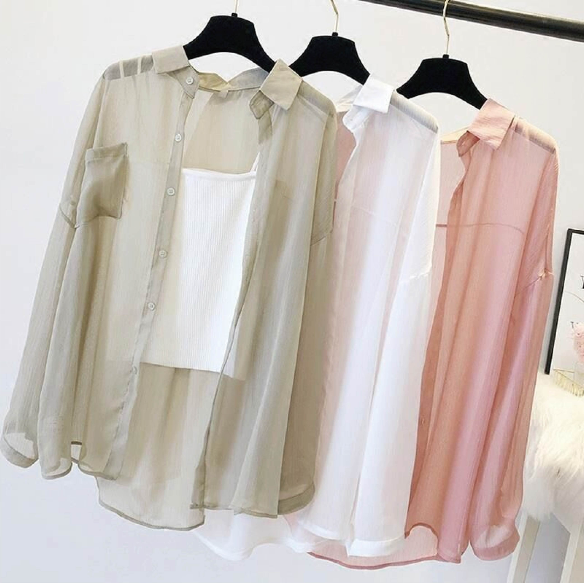 【Helena】韓版薄襯衫 落肩寬鬆襯衫 素色襯衫 雪紡襯衫 防曬襯衫 外搭襯衫 女裝【A132】