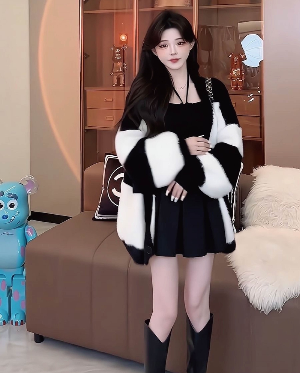【Helena】條紋V領加厚針織外套 水貂絨毛衣 撞色黑白條紋毛毛絨開衫外套 慵懶風韓版寬鬆百搭針織衫【A2145】