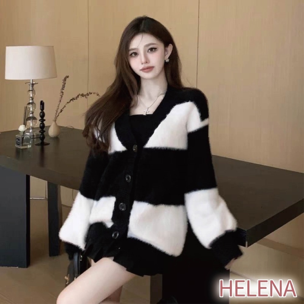 【海麗娜】條紋V領加厚針織外套 水貂絨毛衣 撞色黑白條紋毛毛絨開衫外套 慵懶風韓版寬鬆百搭針織衫【A2145】