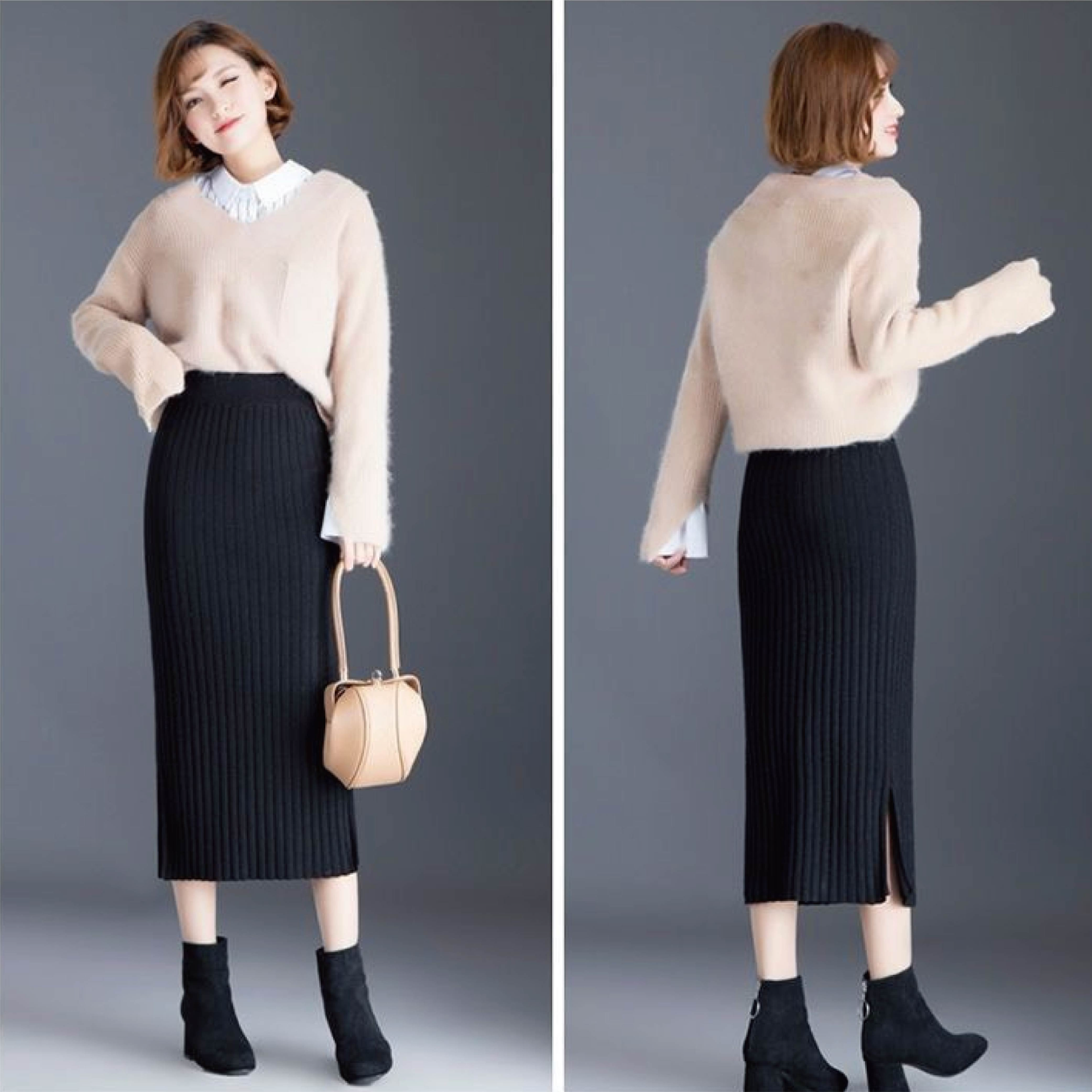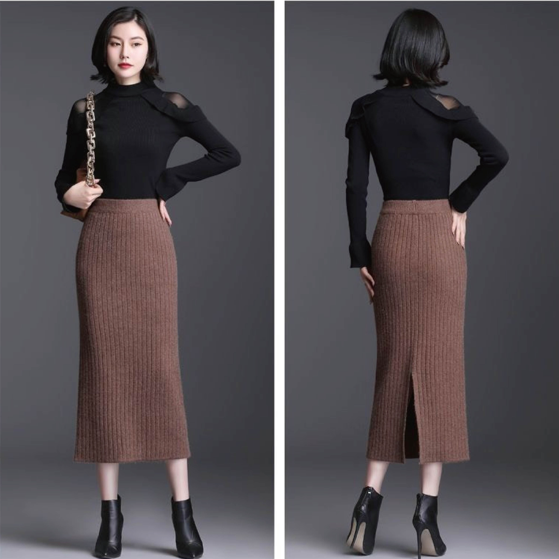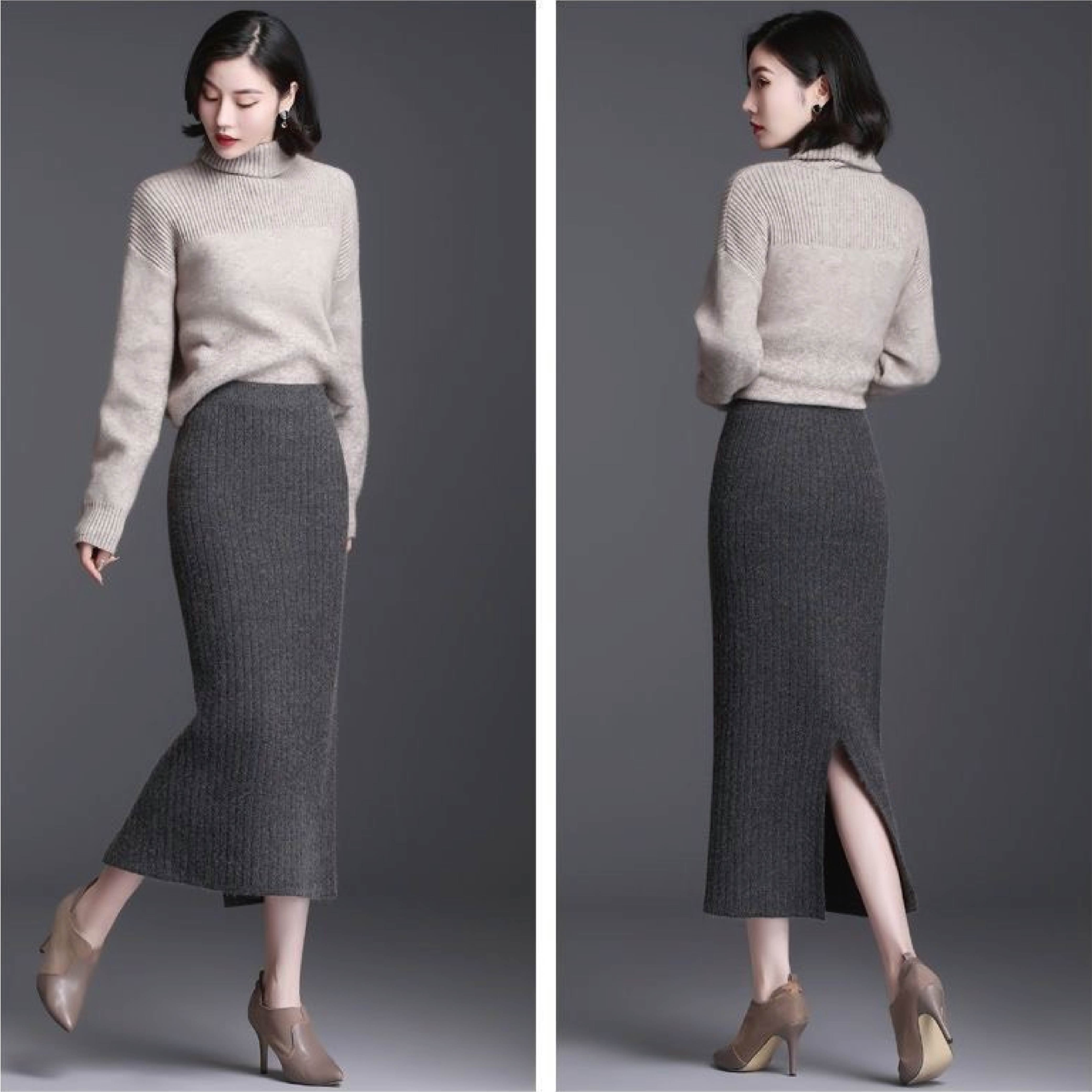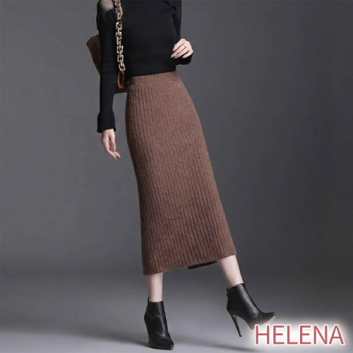 【Helena】開叉針織長裙 半身裙 針織裙 坑條毛線裙 素色韓版高腰顯瘦中長版包臀裙 裙子 女裝【C220】