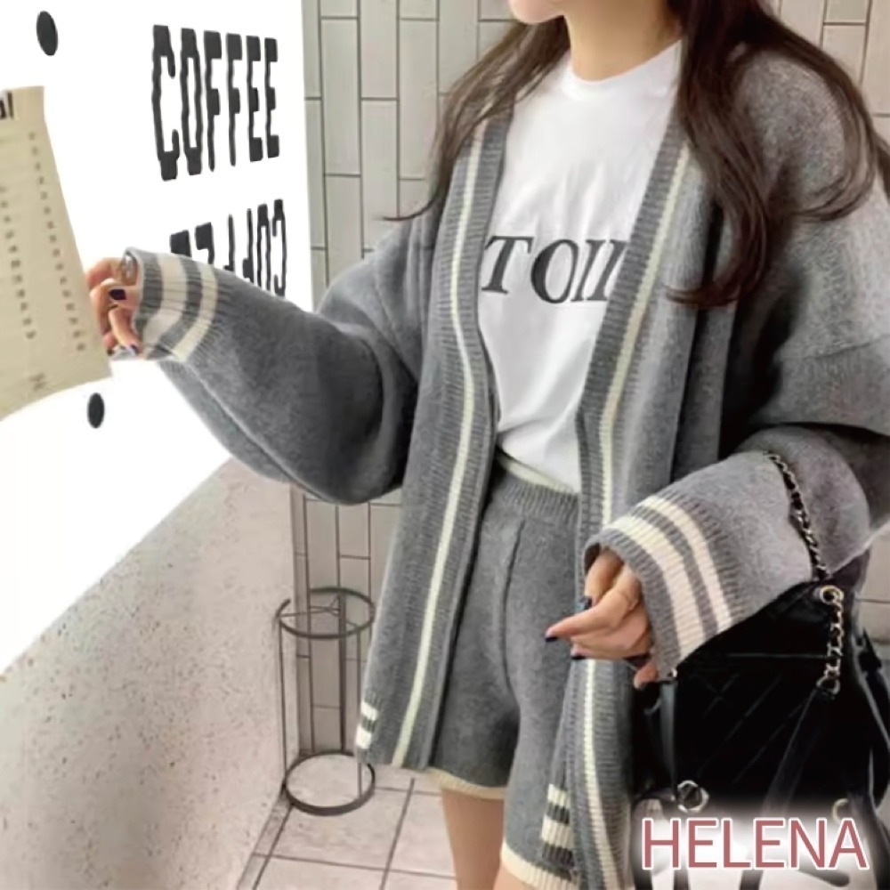 【Helena】配色針織套裝 拉鍊毛衣外套 軟糯針織 學院慵懶風滾邊開衫毛衣短褲套裝 運動套裝 女裝【A2206】