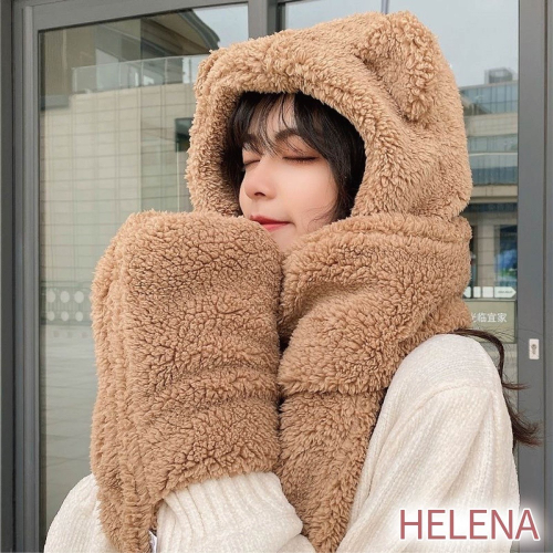 【7-ELEVEN門市團購】【海麗娜】小熊帽子圍巾 圍脖 熊熊圍巾 帽子圍巾手套一體 保暖舒適百搭絨毛圍巾【D97】