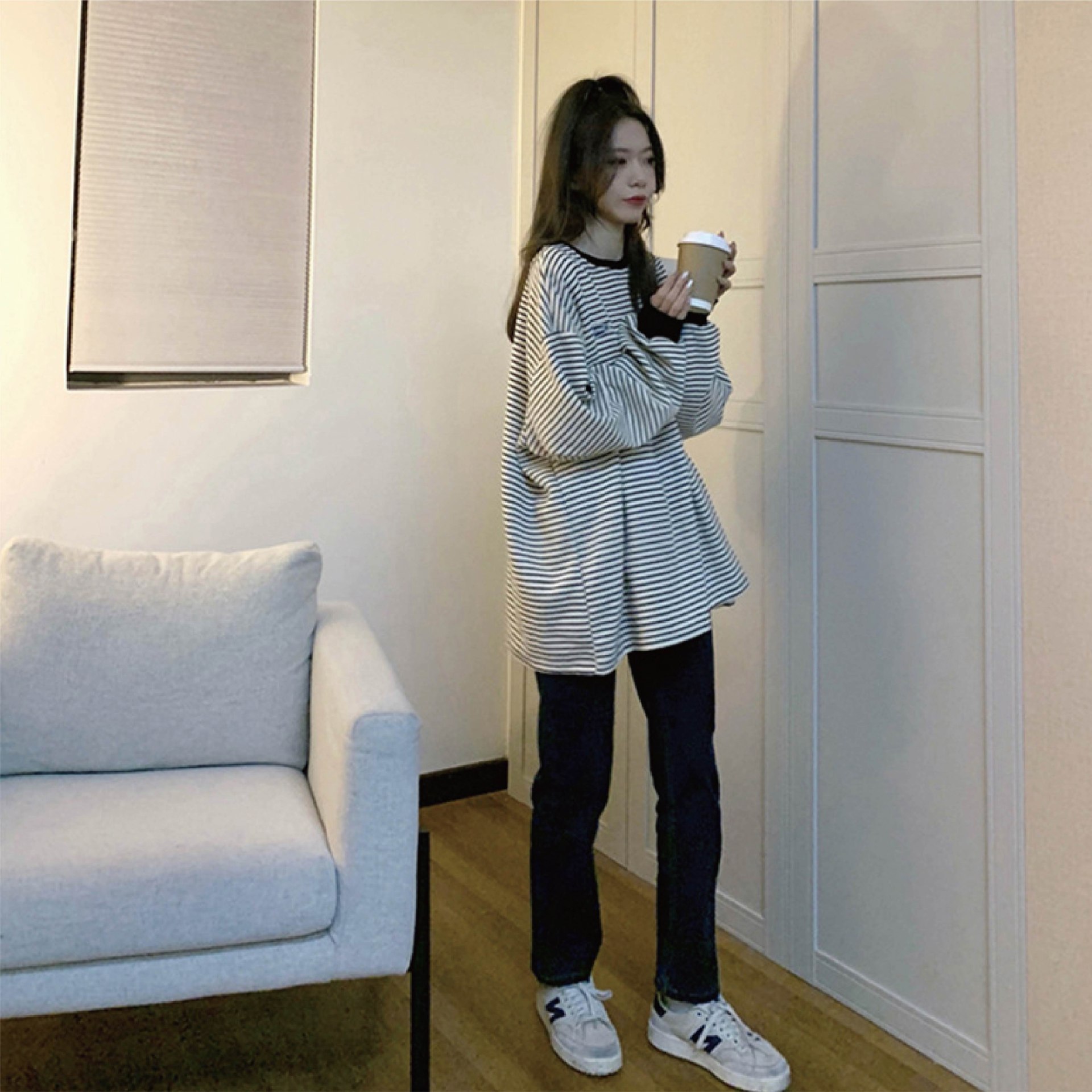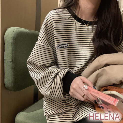 【海麗娜】韓版條紋寬鬆長袖上衣 大學T 薄款衛衣 長袖t恤 男友風顯瘦圓領打底衫 上衣女 秋冬【A2197】