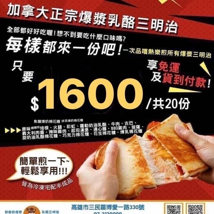 【熱樂煎爆漿乳酪】加拿大三明治全來一份吧!20份只要1600免運