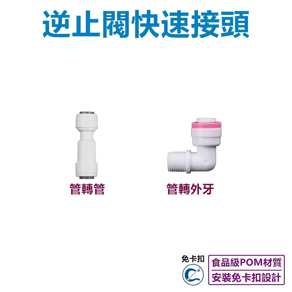 ●逆止閥快速接頭免卡扣設計,PE管不脫管,不漏水,組裝方便,省時省力,各式淨水設備均可適用。