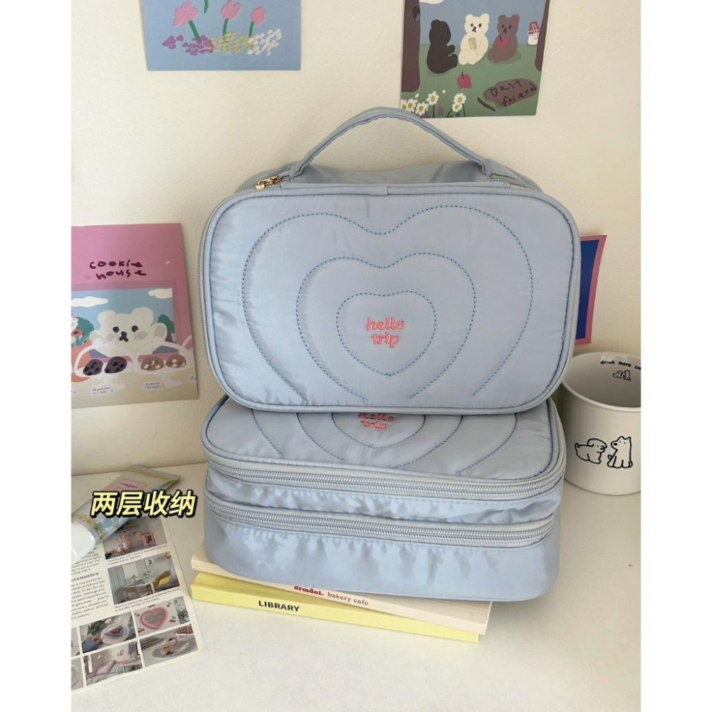 海鹽藍 手提翻蓋化妝包 分層 外出旅行 洗漱包 大容量化妝包 ins 手提 便攜 收納包 洗漱包 出國 化妝收納 收納盒