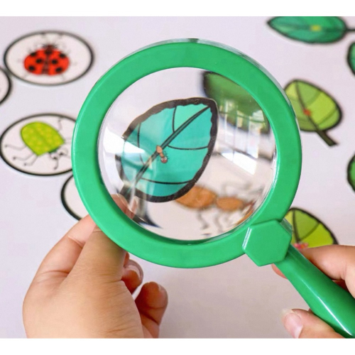 1. 將昆蟲卡與樹葉卡混合,孩子用放大鏡尋找並配對昆蟲。