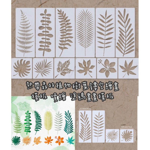 ✅熱帶森林植物樹葉鏤空繪畫 模板 噴繪 塗鴉畫畫模板 (植物+葉片) 植物模板 葉子模板 樹葉12pcs  尺碼參考圖片 +1=12片 材質PET