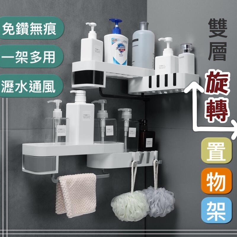 🍀台灣現貨🍀浴室雙層旋轉置物架 無痕置物架 免打孔浴室置物架 浴室廚房置物架 收納架 浴室置物架 無痕置物架 廁所