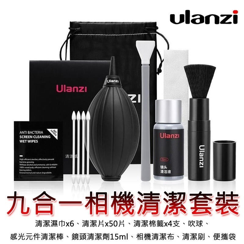 清潔濕巾x6、50片清潔片x1、清潔棉籤4支裝x1、吹球x1、感光元件清潔棒(16mm適用APS-C半幅相機)x1、鏡頭清潔劑15mlx1、相機清潔布10*10cm x2、清潔刷x1、便攜袋x1