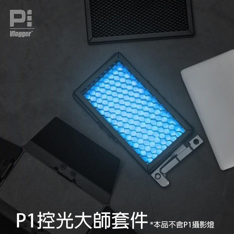 磁性基座x1、柔光片x1、矽膠柔光罩x1、四葉片x1、30度蜂巢x1、60度蜂巢x1、收納袋x1 (無包含示範用的 P1 RGB 攝影燈)