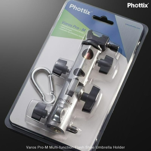 ‧ 此已獲專利的Phottix Varos Pro 攝影傘支架由專業攝影師設計,用於將熱靴閃光燈或攝影傘安裝到閃光燈架或三腳架。是外景拍攝或影樓拍攝的完美工具。攝影傘能產生柔和的光線,非常適合肖像拍攝或特殊效果的拍攝。此新型Varos比原來的版本強三倍。由鋁合金材料製作而成,帶金屬冷靴3/8和1/4內螺紋嵌入件以及3/8 和 1/4外螺紋。