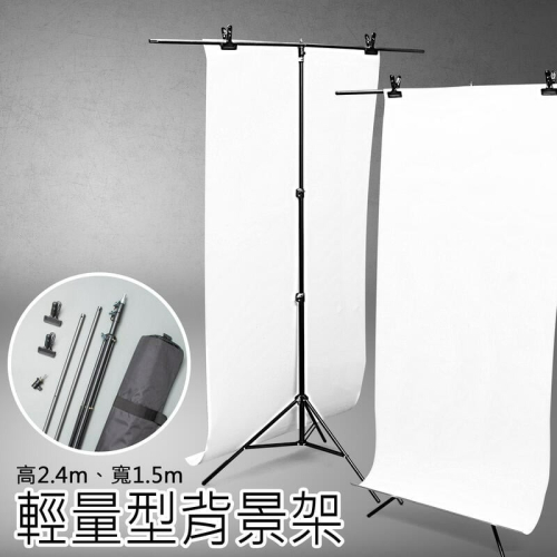 2.4米輕量型燈架x1、組合式背景桿x2、燈架轉接座x1、T型大力夾x2、收納袋x1
