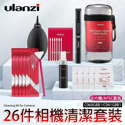 ‧Ulanzi C026 APS-C / CO28 全片幅 相機清潔套裝包含26件相機清潔必備物品:相機感應器清潔棉籤、濕清潔布、清潔液、吹球、專業鏡頭清潔筆、鏡頭清潔液、棉籤、光學清潔紙紙和儲存容器