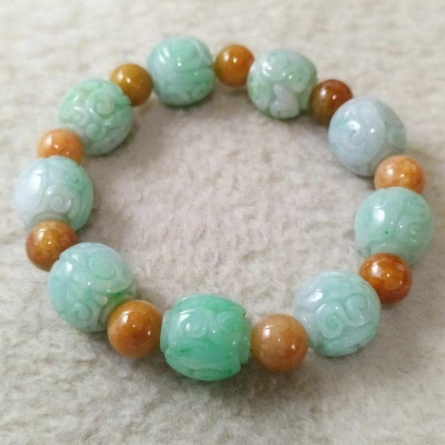 📿雕花珠手串📿天然緬甸玉 A貨 翡翠 飄綠花 雕花珠+黃翡 圓珠 手串 手鍊 手珠 珠鍊 串珠 現貨特價【92jade】