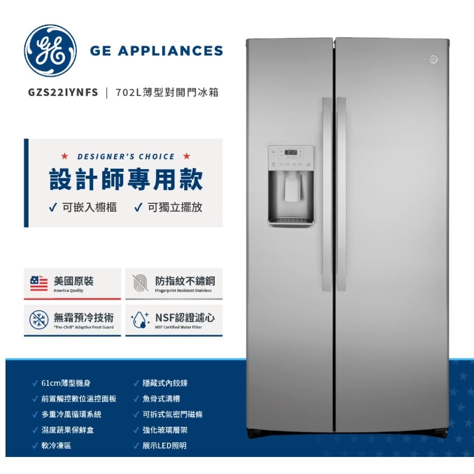 GZS22IYNFS【GE奇異】702L防指紋不銹鋼薄型對開門冰箱