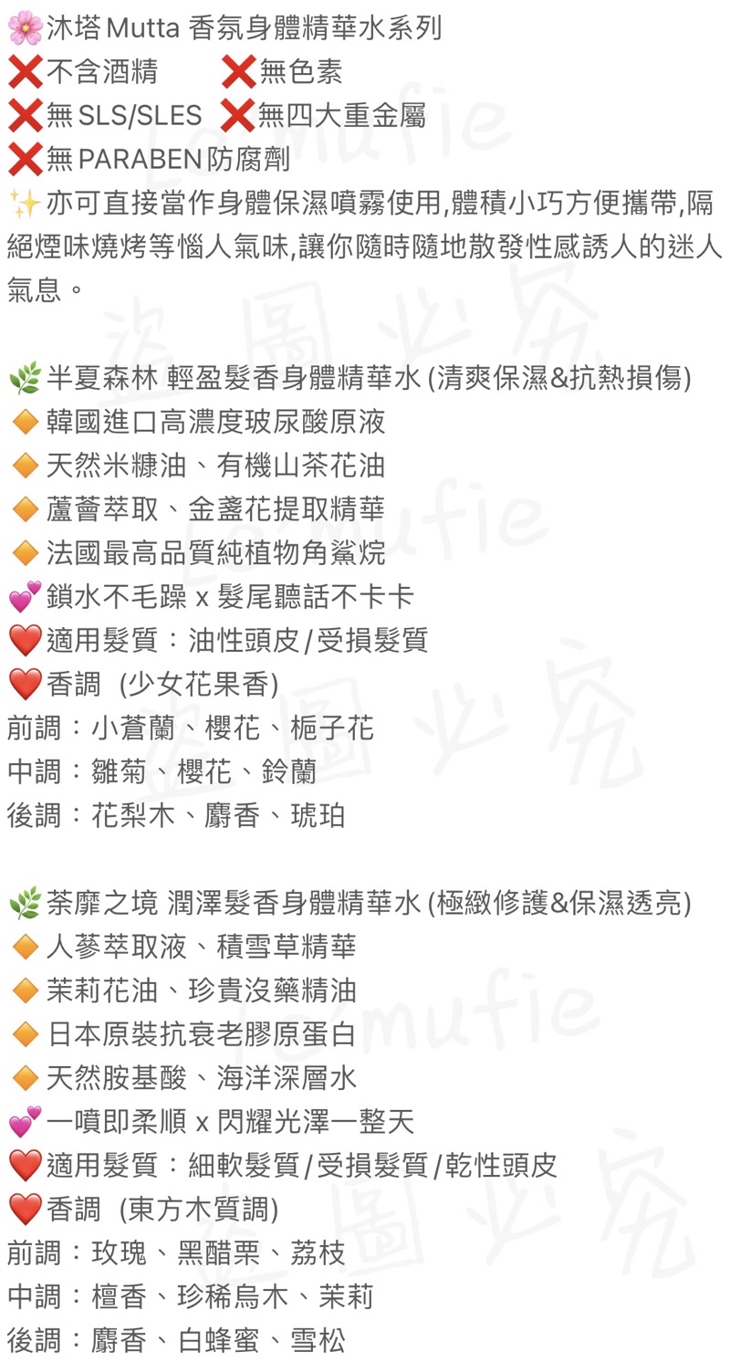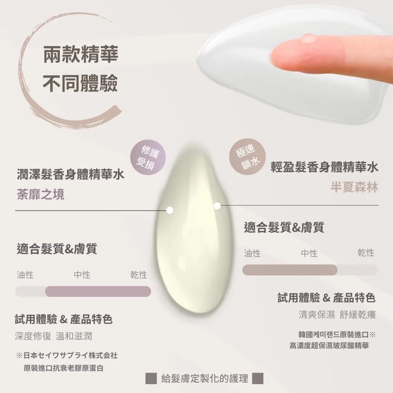 將頭髮擦至半乾,噴灑適量精華水於髮絲和肌膚。