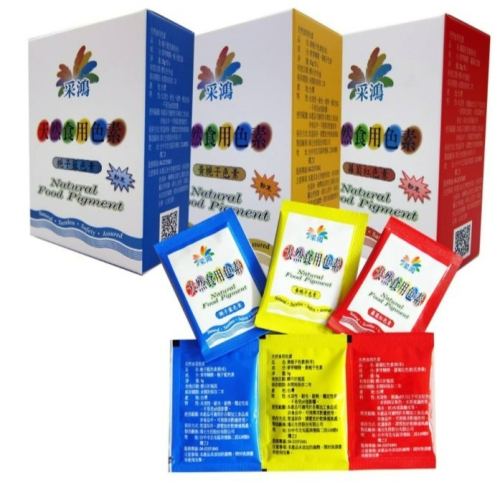 梔子色素系列的原料梔子果實,採用台灣本土種植的梔子果實,從初製粹取到精製原料......,從一開始只有黃色到後面經鴻元公司的研發技術而成功得到藍色和紅色......,特性是水溶性、耐光、耐高溫、穩定性高、衰退率低、不易受ph值影響,可謂是天然色素界的巨星 讓大家安心使用的天然色粉,不用溶水可直接使用。色、香、味 俱全! 品名: 采鴻天然食用色粉 規格:3g/包 原裝 顏色 : 9種顏色可選擇,梔子藍色/黃梔子色/蘿蔔紅色/梔子紫色/梔子綠色/梔子紅色/紫甘薯色/紅麴色/梔子紅色素粉末(A) (梔子紅色素粉末:近玫瑰紅色,梔子紅色素粉末(A):近深粉紅色) 成份: 1.蘿蔔紅色素:麥芽糊精、蘿蔔紅色素 2. 梔子紅色素:麥芽糊精、梔子鴻色素 3.紅麴紅色素:麥芽糊精、紅麴紅色素 4.黃梔子色素:麥芽糊精、黃梔子色素 5.梔子藍色素:麥芽糊精、梔子藍色素 6. 梔子綠色素:麥芽糊精、梔子黃色素、梔子藍色素 7. 梔子紫色素:麥芽糊精、梔子紅色素、梔子藍色素 8.梔子紅色素粉末(A):麥芽糊精、梔子紅色素 9.紫甘薯色素粉末 :麥芽糊精、紫甘薯色素 顏色說明: 色粉會受到添加的產品原料、pH質及烤焙過程影響成色。 假設是使用在白色的麵糰(饅頭)-pH值5.5為例: 紅蘿蔔紅:像粉紅色;梔子紅:像玫瑰/紅酒色;紅麴紅:稍微偏橘紅色。(紅蘿蔔紅遇鹼性的話會呈現偏紫色) 紫甘藷:中性範圍內則呈現(紫色地瓜的)紫色(鹼性範圍內變為藍色;酸性範圍內呈現紅色)梔子紫:像葡萄皮的紫色。 保存方式:請置放於陰涼處,避免日曬 有效期限:請聊聊詢問喔~~~ 應用範圍皆為 : 烘焙產品、糖果、飲料、餅乾、一般食品及非食品,凡有需要添加顏色之商品 使用範圍 : 本產品可適用於各類加工食品或非食品中,可是需求酌量使用 注意事項皆為 : 天然色素忌長期光照,請用避光材質之容器,避免長期照光而造成顏色衰退。 本產品為天然植物萃取,皆有其特殊氣味,稀釋後若發生沉澱狀況純屬自然現象, 請安心使用。本產品為添加防腐劑,開封後請盡早使用完畢,以免受潮。