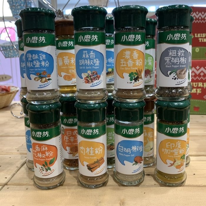 1.產品名稱 湯用胡椒粉 產品簡述 小磨坊湯用胡椒粉是由胡椒與香芹精緻調和,即席灑用於湯類與麵類,更能提升香氣的表現。 淨重(g) 26g 成份 黑胡椒、白胡椒、香芹。【純素】 2.產品名稱 印度咖哩粉 產品簡述 小磨坊根據經典,調和多種天然香辛料,調配出微辣、香氣持久且口感濃郁的印度風味咖哩,本配方沿用數十年,為小磨坊人氣商品。 淨重(g) 25g 成份 胡荽、薑黃、薑母、馬芹子、小荳蔻、葛縷子、葫蘆巴、蒜粉、黑胡椒、肉桂、丁香、紅辣椒、荳蔻、小茴香、月桂葉【植物五辛素】 3.產品名稱 薑黃粉 產品簡述 薑黃粉又名鬱金香粉,小磨坊薑黃粉的鮮黃色澤和香味,不僅可添於咖哩中提升香氣,也可用於米飯中增添色澤。 淨重(g) 34g 成份 薑黃 【純素】 4.產品名稱 香蒜粒 產品簡述 小磨坊香蒜粒可替代新鮮蒜頭使用,用於醃製肉類可達去腥的效果;於菜餚盛盤時用也可更添香氣。也可與奶油融合,製成香蒜抹醬。 淨重(g) 35g 成份 蒜頭。【植物五辛素】 5.產品名稱 濃香五香粉 產品簡述 小磨坊濃香五香粉具有肉桂的甘甜與小茴香的芬香,適用於醃肉、燒烤及滷味等肉類料理。 淨重(g) 20g 成份 肉桂、小茴香、胡荽、丁香、八角、香芹。【純素】 6.產品名稱 肉桂粉 產品簡述 小磨坊肉桂粉具濃郁香氣和芳香甜味的肉桂適用於烘焙甜點、灑用於咖啡或熱飲,和調製醃醬與滷汁。 淨重(g) 20g 成份 肉桂、甘草。【純素】 7.產品名稱 迷迭香葉 產品簡述 香味濃郁的小磨坊迷迭香葉適用於醃漬肉類,或用於西點餅乾中,皆可增添特殊香氣。 淨重(g) 20g 成份 迷迭香葉。【純素】 原產地:台灣 保存方式:開封後請放置冰箱冷藏並儘速食用完畢。 有效期限: 請聊聊詢問~~~