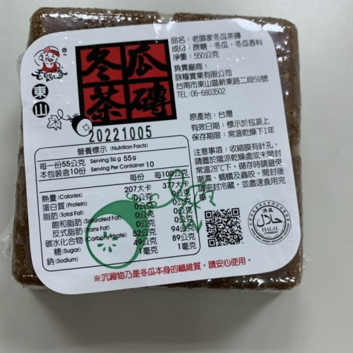 品名:老頭家 冬瓜茶磚 成分:蔗糖、冬瓜、冬瓜香料 原產地:台灣 規格:550公克/塊 保存方法:放置陰涼處,開封後需冷藏 注意1.沉澱物乃是冬瓜本身的纖維質,請安心食用。 注意2.收縮膜有針孔,請置於陰涼乾燥處或末開封常溫28*C下,儲存時請避免潮濕、螞蟻及蟲咬。開封後請密封冷藏,並盡速食用完畢。 有效期限:請聊聊詢問~~~