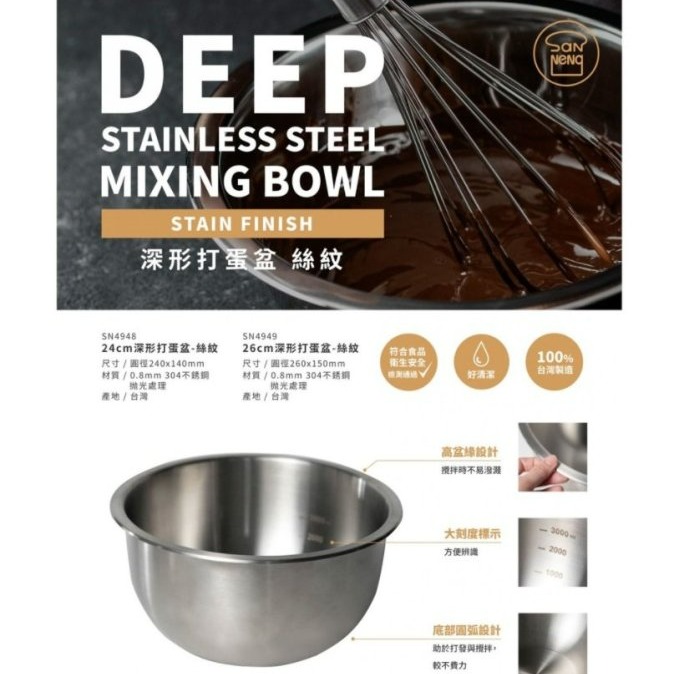嚴選SHOP為台灣三能正式簽約,指定網路通路經銷商 我們供應的所有三能產品,皆為100%台灣製原廠貨 網路上充斥著許多大陸製三能水貨,甚至仿冒的三能模具 附圖有合約為證,請您放心跟我們購買 我們保證您拿到的所有三能商品,都是台灣三能生產製造 網路買三能,請認明【嚴選SHOP】,再也不用擔心買到仿品! #304不銹鋼 #拋光處裡 SN4948 尺寸:圓徑240*高度140MM SN4949 尺寸:圓徑260*高度150MM 台灣製造,304不鏽鋼材質,符合食品衛生要求,使用起來超安心!! 不同於市面上較矮的打蛋盆,高盆緣設計,攪拌時不易潑濺,使用更容易!! 超貼心設計,內壁刻度(公升)標示,方便觀察發酵狀況或容量量測,配方穩穩妥妥不失敗!! 與其他打蛋盆不同,此款的底部採取圓弧設計,助於打發與攪拌,較不費力,輕鬆做烘焙!! 此打蛋盆除了可以攪拌、打發還可用來洗滌蔬果、裝盛食材,也可放置發酵,相當多用途唷!!