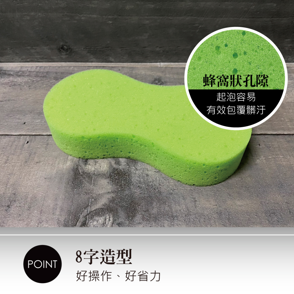 8字真空洗車海綿,8字造型符合人體工學,省力好操作,特選蜂窩狀孔隙海綿,起泡容易並可有效包覆髒汙,避免刮傷漆面。