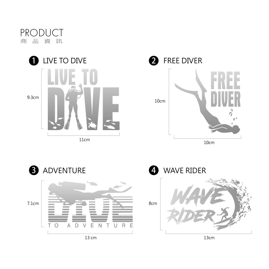 水上活動系列反光車貼,包括自由潛水、水肺潛水、衝浪等多種主題,細膩反光質感並兼具耐用度