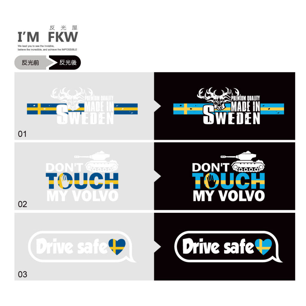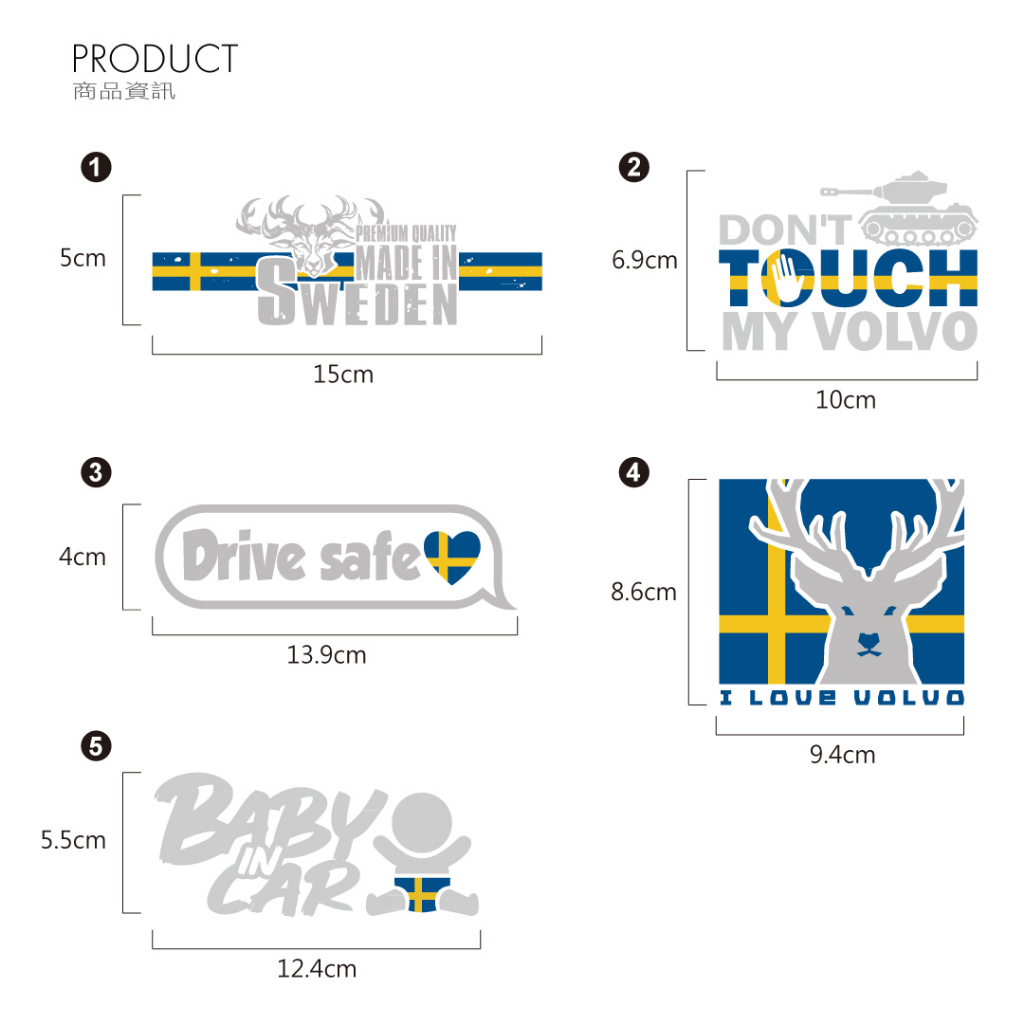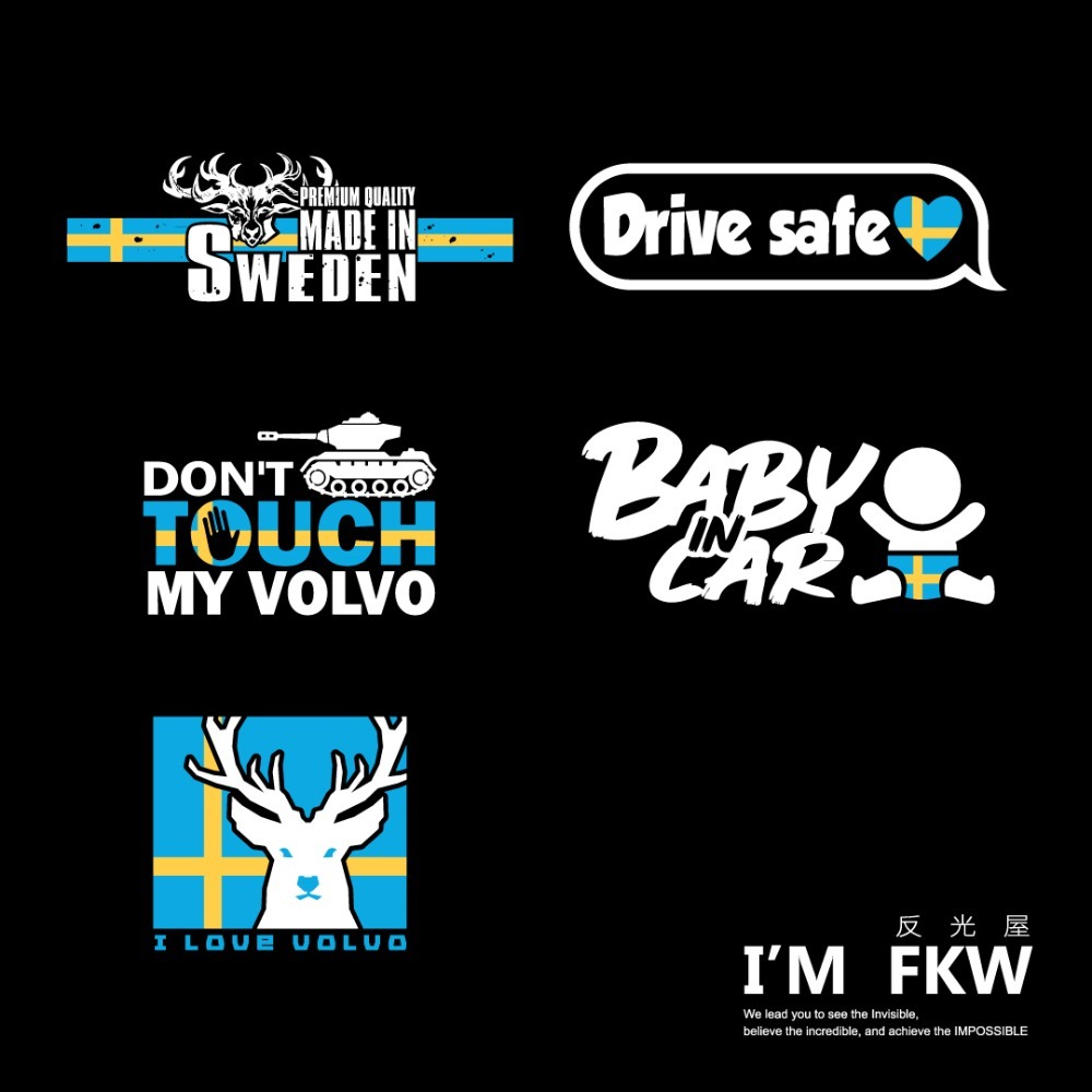針對瑞典車系設計,擁有baby in car、Do not touch my car多種主題反光貼紙。