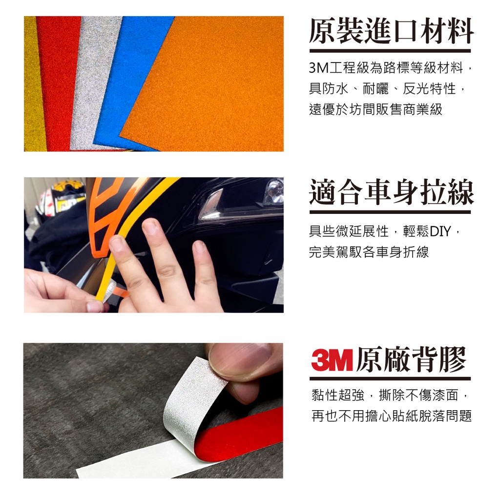 3M工程級反光貼紙,為製作路標等級材料,效果遠優於坊間販售商業級數。高亮度反光,並且具有些微延展性,非常適合用於車身拉線。