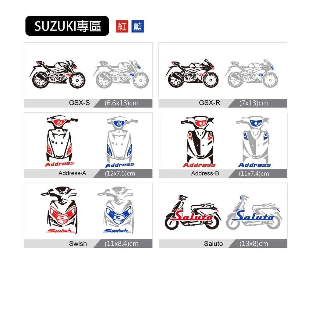 機車車型反光貼紙系列,適合做為車貼使用,採用HHR專利技術製作,無底簍空細膩質感,並擁有高亮度反光效果,防水耐曬,適用於各種光滑平順面。目前SUZUKI車系已有:GSX-R、GSX-S、Address、Saluto、Swish。