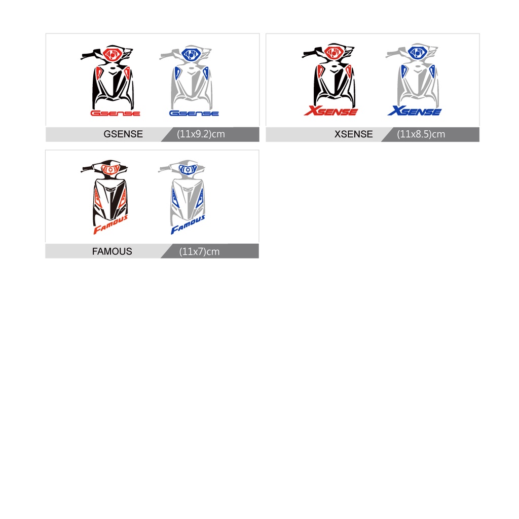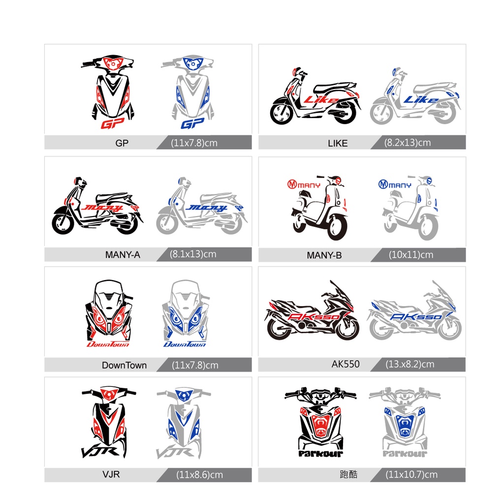 機車車型反光貼紙系列,適合做為車貼使用,採用HHR專利技術製作,無底簍空細膩質感,並擁有高亮度反光效果,防水耐曬,適用於各種光滑平順面。目前KYMCO車系共推出:雷霆S、雷霆王、雷霆、VJR、G6、G6E、LIKE、MANY、KRV、Downtown、FAMOUS、XSENSE、GSENSE、GP、跑酷、AK550。