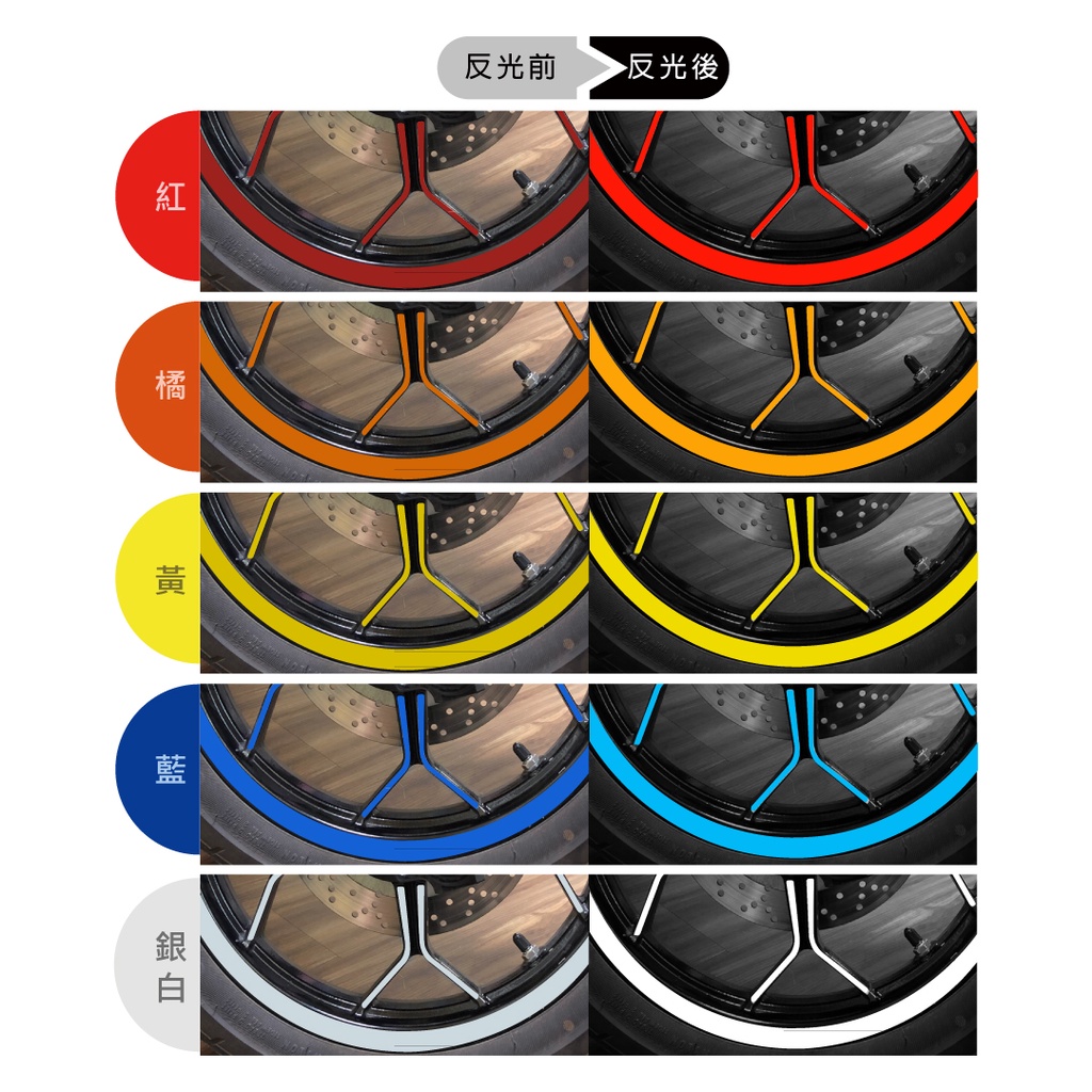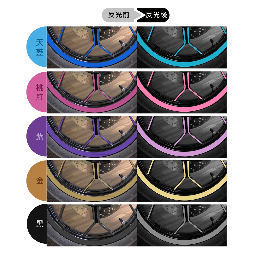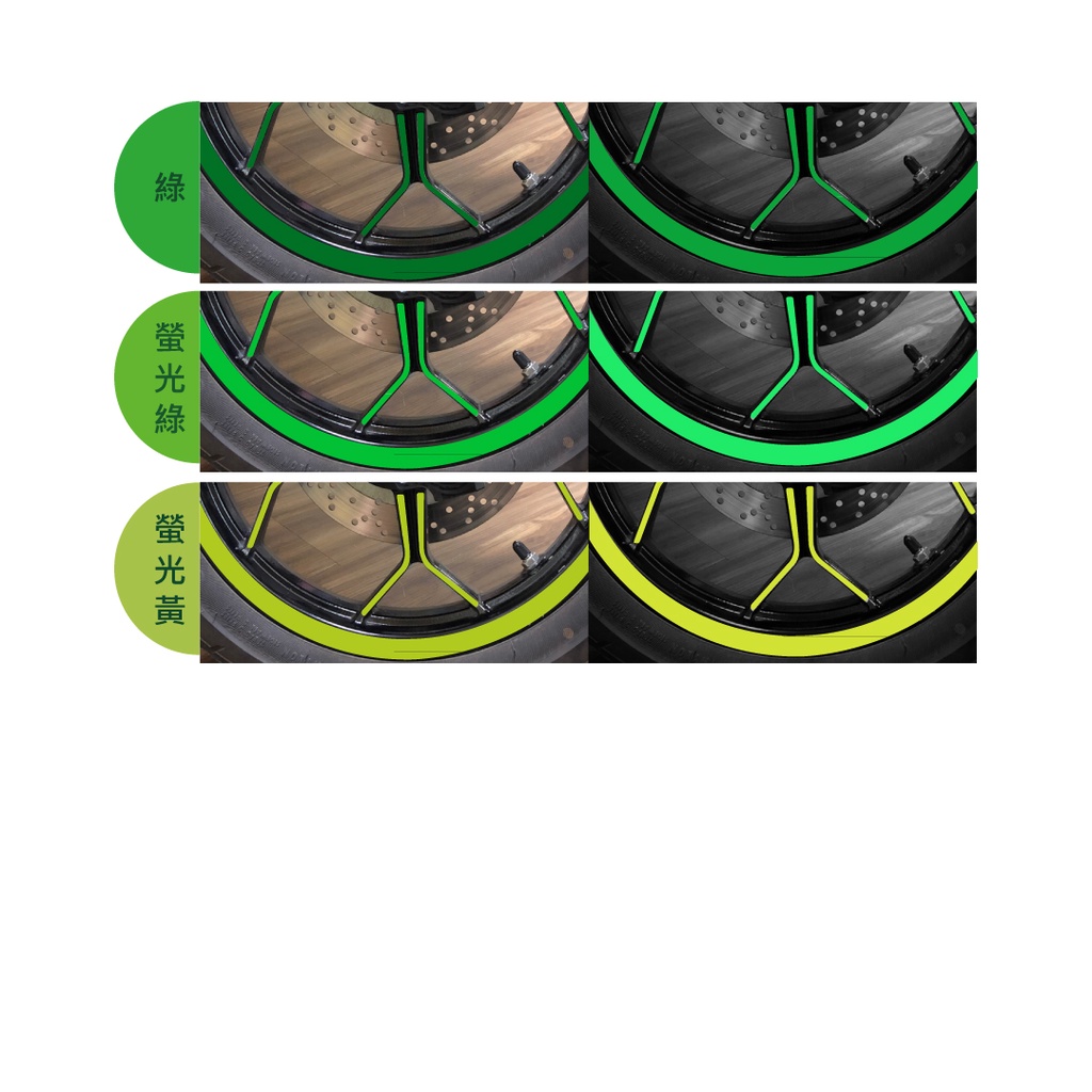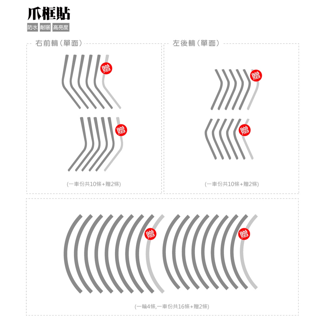 •1部車購買1份即可,每份包含2面爪貼(前輪右側+後輪左側)及13+14吋15mm輪框貼(四面)