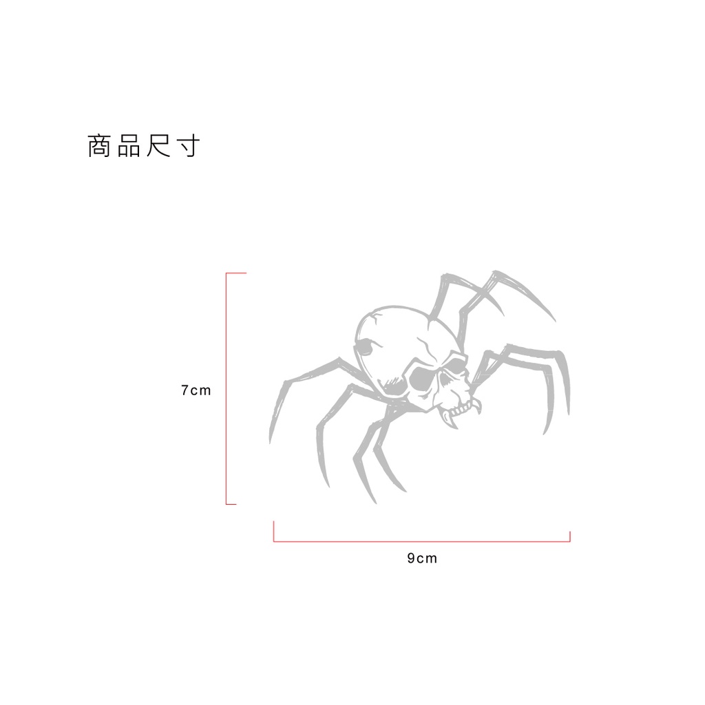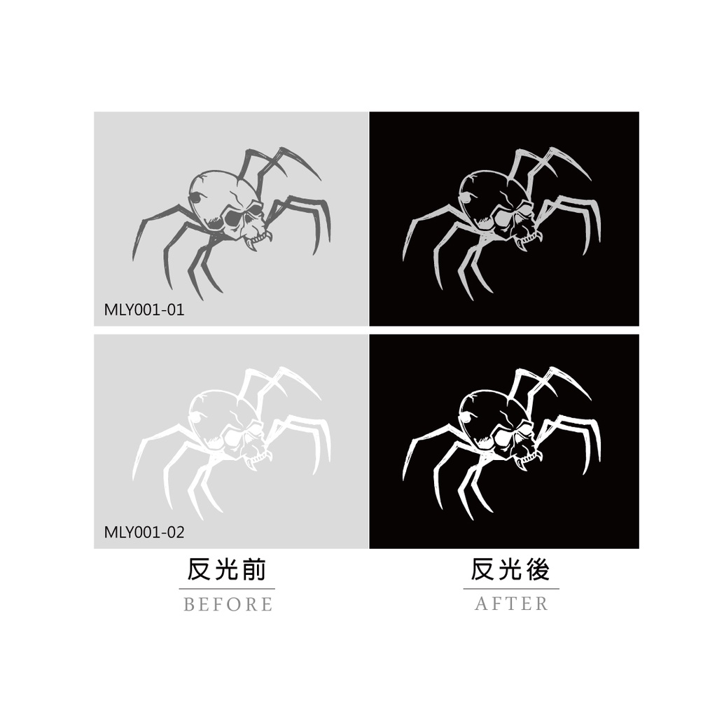 骷髏蜘蛛反光貼紙,採用HHR專利技術網版印刷製作,貼紙具有防水、耐曬、高亮度反光等特性,非常適合作為車貼使用。