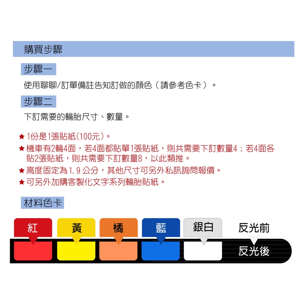 • 建議不要使用輪胎油,以保持貼紙表面清潔,延長使用壽命