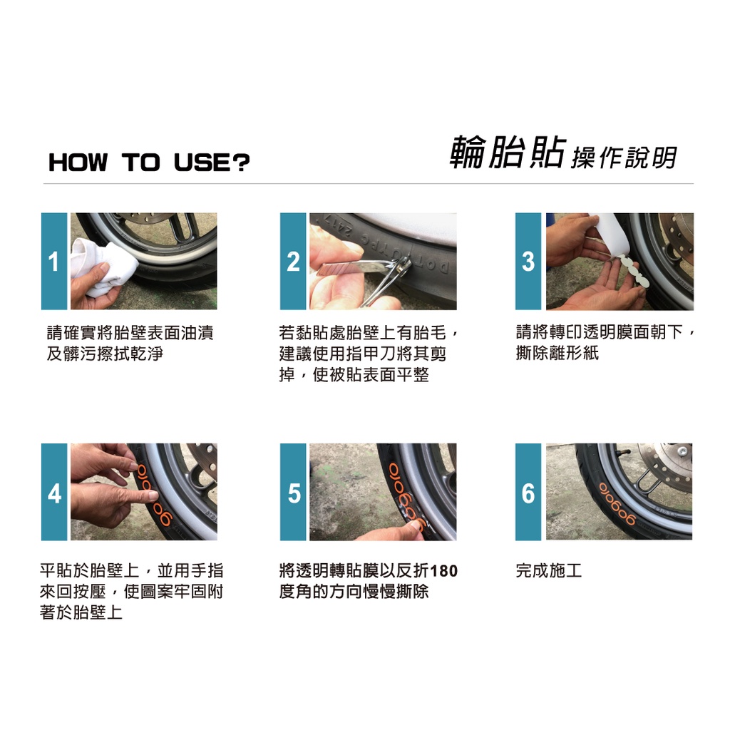 • 建議不要使用輪胎油,以保持貼紙表面清潔,延長使用壽命