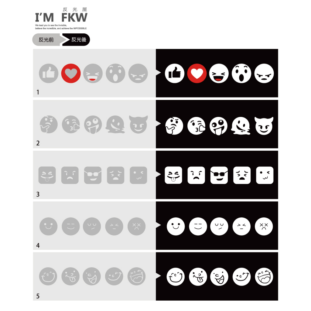 FACEBOOK表情符號反光貼紙,喜怒哀樂超可愛表情,採用HHR專利技術網版印刷製作,貼紙具有防水、耐曬、高亮度反光等特性,非常適合作為車貼使用。