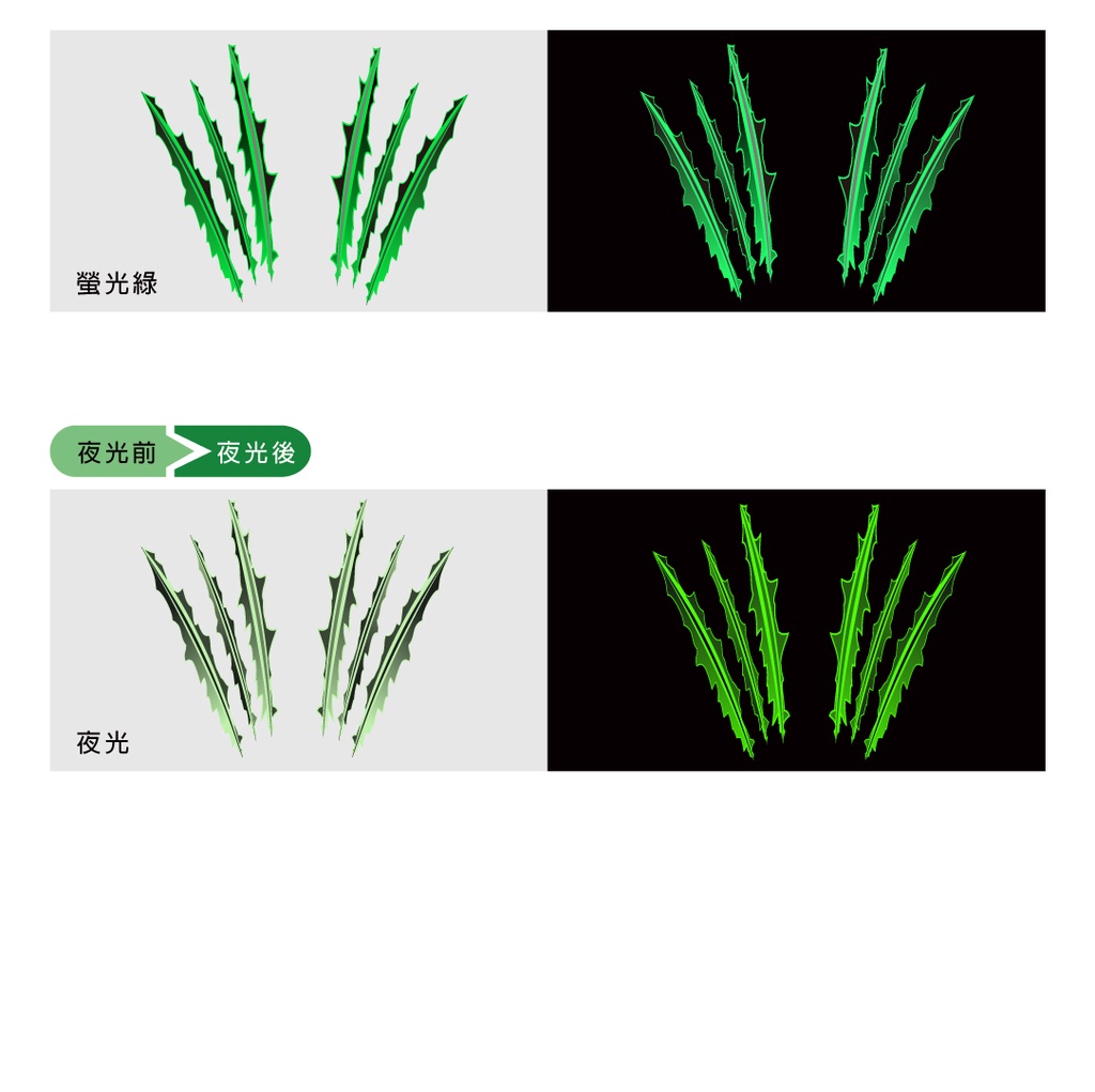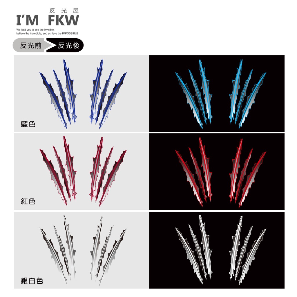 爪痕反光貼紙,野獸氣息爆增,就靠這款了!採用HHR專利技術網版印刷製作,貼紙具有防水、耐曬、高亮度反光等特性,非常適合作為車貼使用。