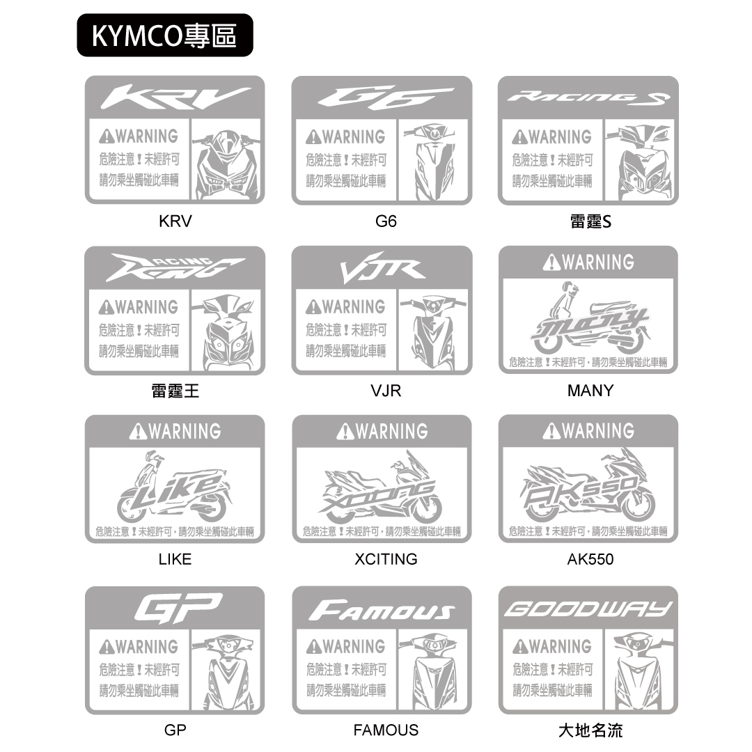 警告標籤反光貼紙,警示意味超濃的機車貼紙,針對車種設計不同的車型貼。危險注意!未經許可請勿乘坐觸碰此車輛。KYMCO車系專屬有:雷霆S、雷霆王、VJR、G6、LIKE、MANY、XCITING、KRV、GP、FAMOUS、AK550、大地名流。
