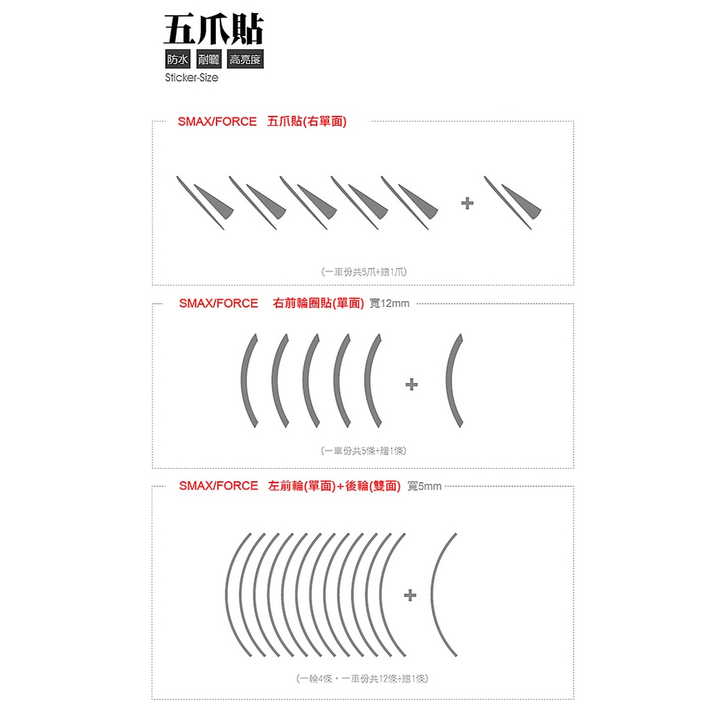 • 1部車購買1份即可,每份包含1面爪貼(前輪右側)及專用輪框貼(四面)
