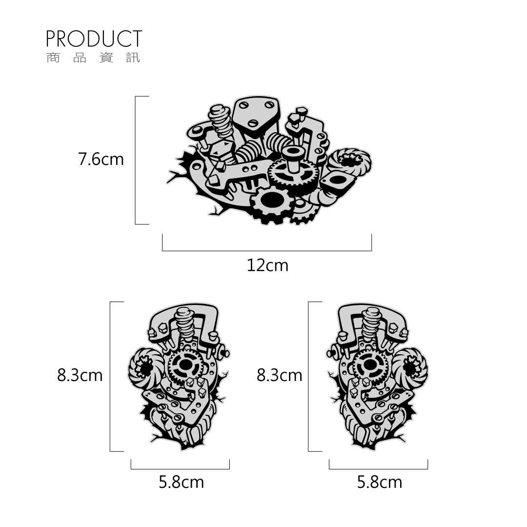 錯綜複雜的齒輪貼紙,適合拿來做為車貼遮傷。採用3M工程級材料網版印刷製作,貼紙具有防水、耐曬、高亮度反光等特性,非常適合作為車貼使用。