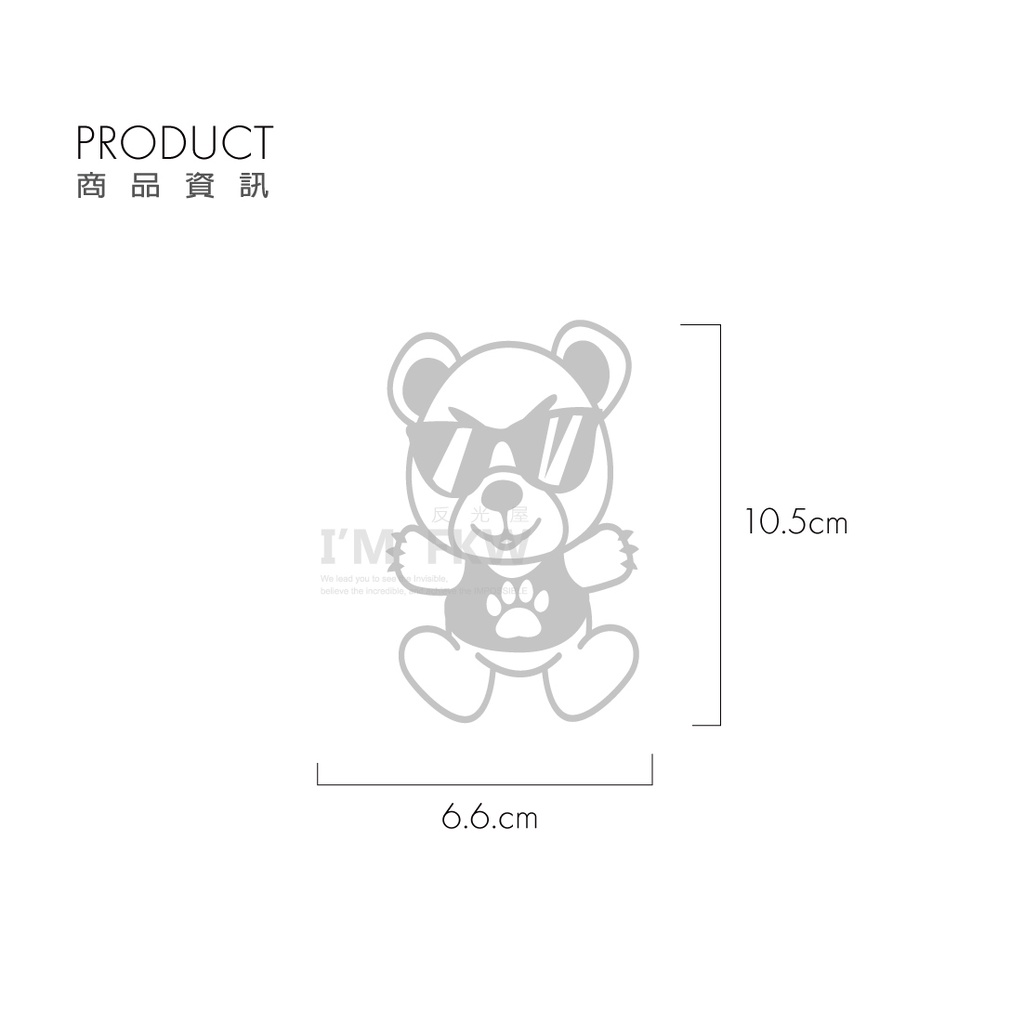 可愛的酷酷熊反光貼紙,採用HHR專利技術網版印刷製作,貼紙具有防水、耐曬、高亮度反光等特性,非常適合作為車貼使用。