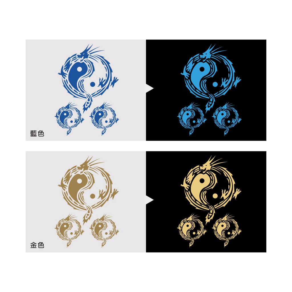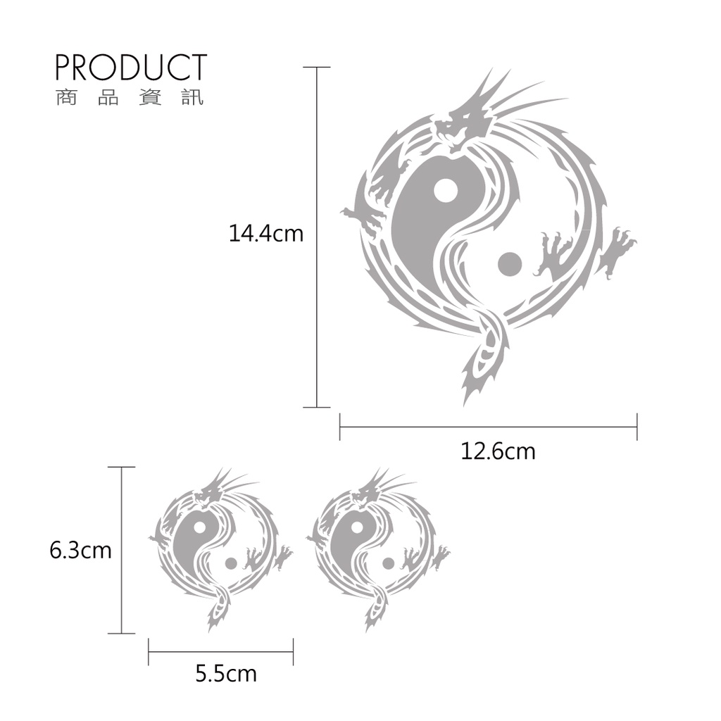 龍反光貼紙,搭配太極圖樣,有著濃濃的中國風味,一份包含3張,可分別在車身不同位置。採用HHR專利技術網版印刷製作,貼紙具有防水、耐曬、高亮度反光等特性,非常適合作為車貼使用。